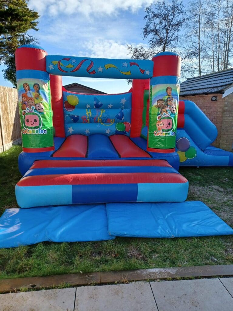 This velcro castle with slide comes decorated with balloons and streamers all over and celebration message displayed on the back wall.