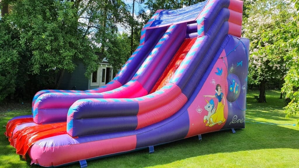 Check out this amazing looking inflatable slide! The pink and purple colours really stand out and the slide comes decorated with unicorns and princess going down the walls make this a very popular choice for girls alike.