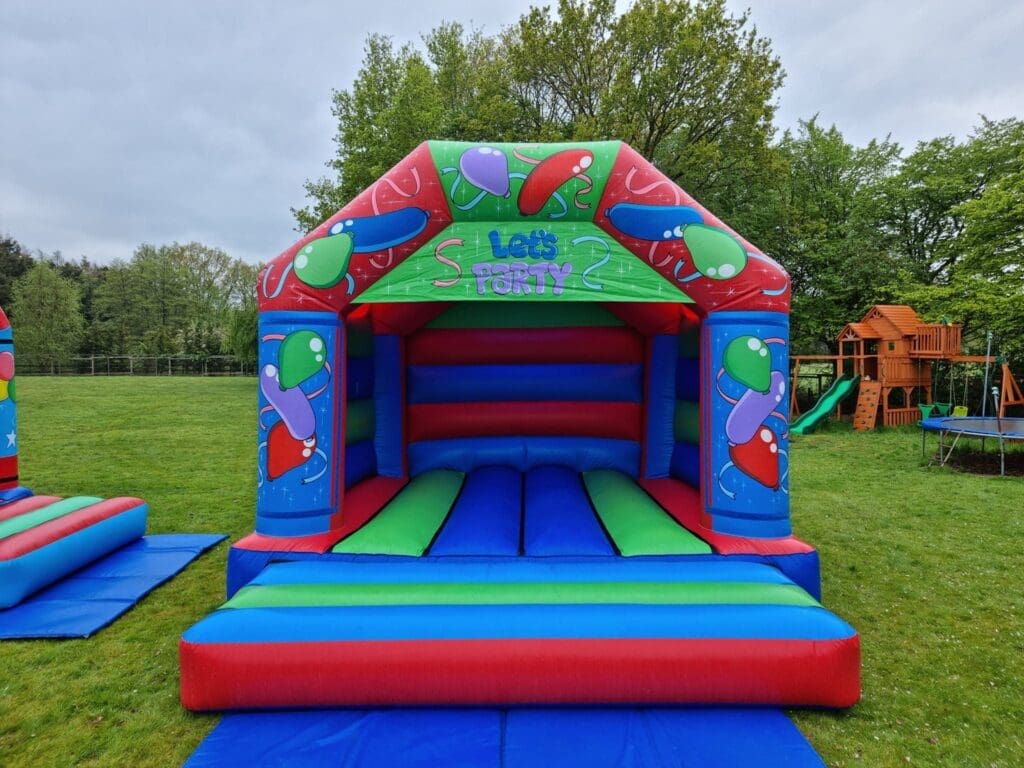 This fantastic adult sized bouncy castle comes decorated in bright colours and full of balloons and streamers, inside and out, making it great for birthdays, weddings, christenings or any occasion being such a generic theme.