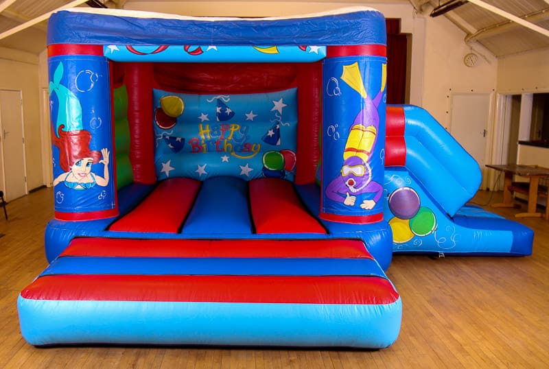 This velcro style bouncy castle comes with pictures of the Little mermaid & Diver displayed on the 2 velcro panels at the front,and is decorated with party hats, balloons and streamers all over with the words ‘Lets party’ or ‘Celebration‘ written across the back wall, and even available in a range of colours and styles!