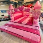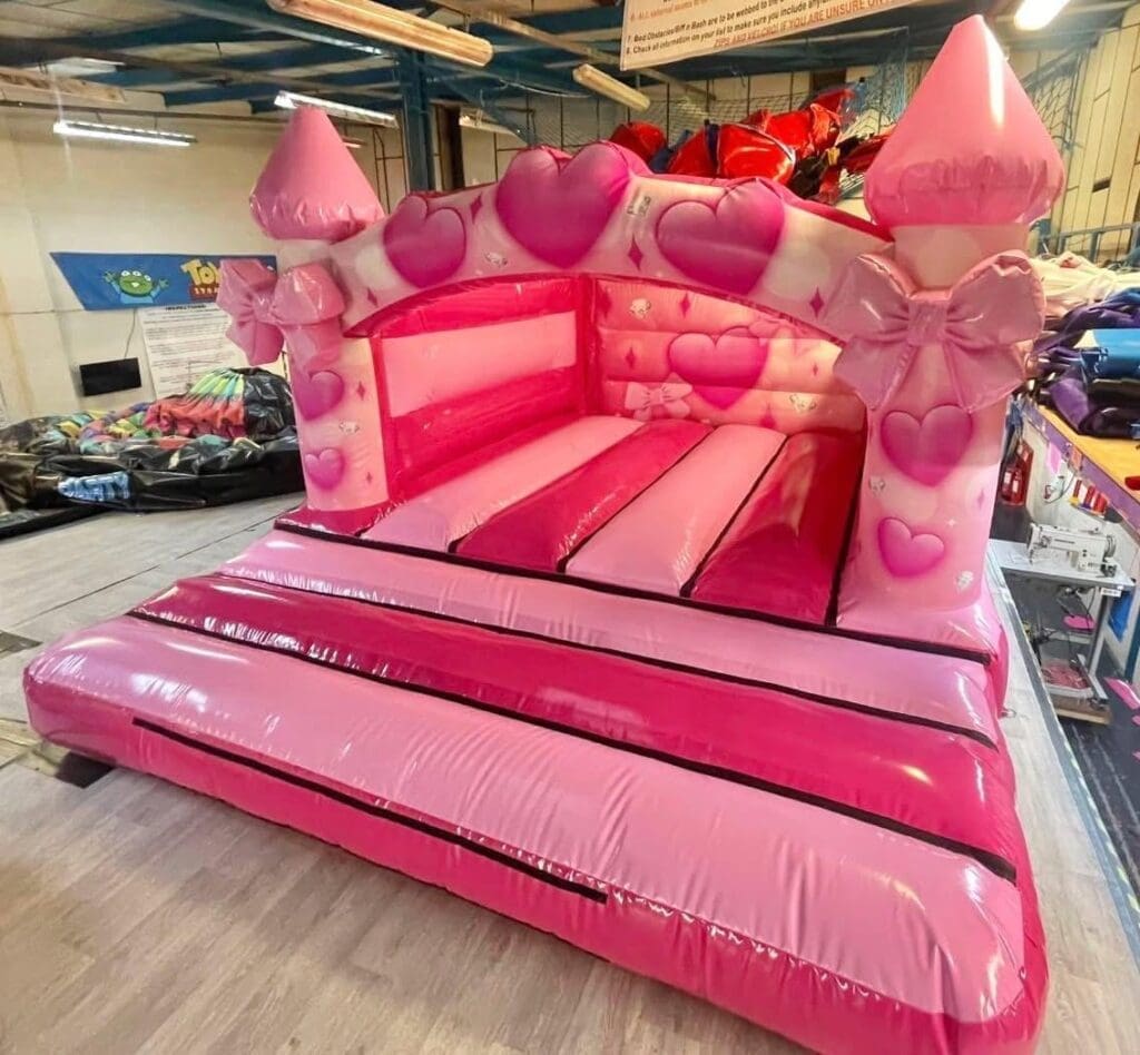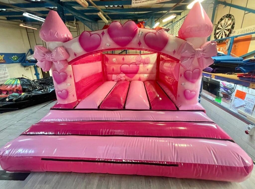 Pink Hearts & Bows bouncy castle with heart artwork and bow detailing – perfect for parties and available to hire in Essex.