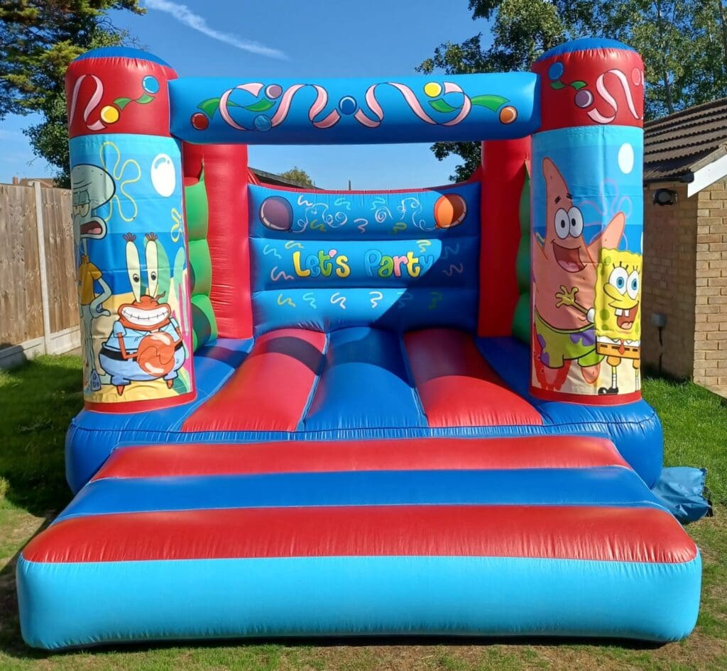 The castle comes with SpongeBob SquarePants himself, Patrick and his colleagues from the crusty crab, Squidward & Mr Crabs displayed across 2 velcro panels and is decorated with party hats, balloons and streamers printed all over with the words ‘Lets party’ or ‘Celebration‘ written across the back wall and even available in a range of colours!