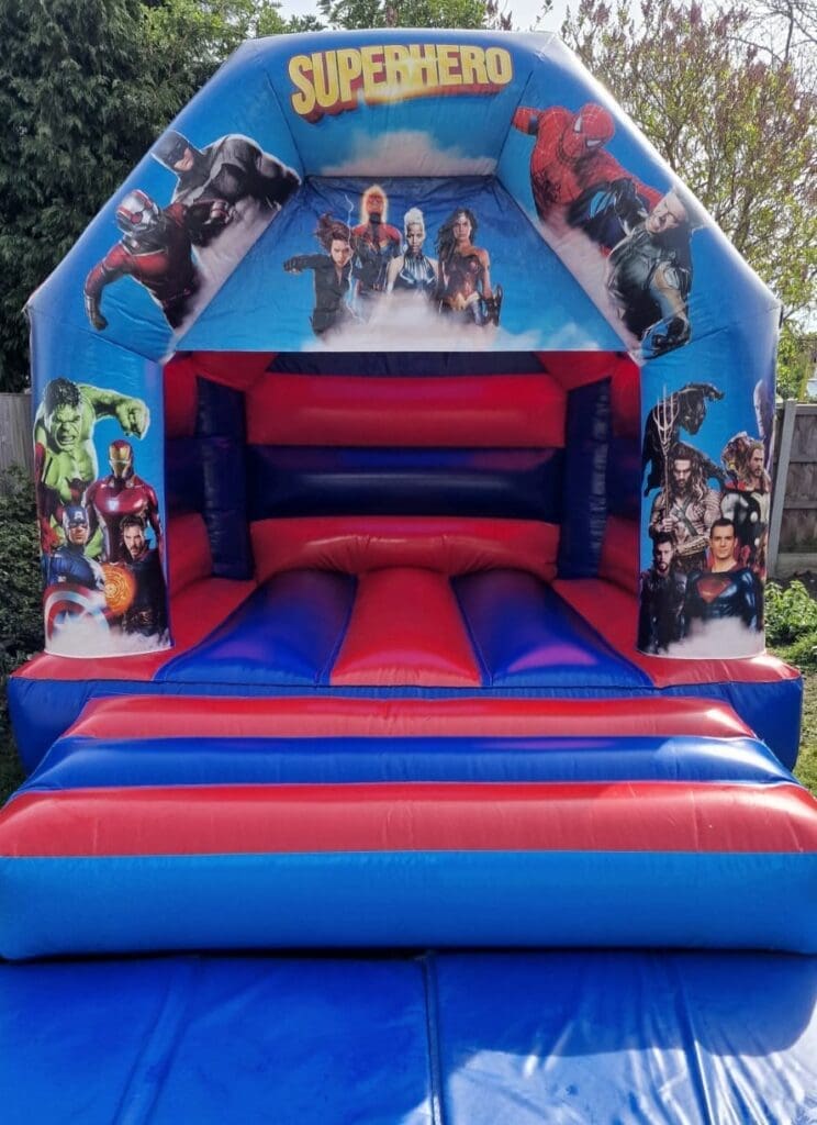 With the range of Superhero inflatables and soft play getting bigger, we are pleased to present this awesome, shiny, fully themed Superhero bouncy castle.